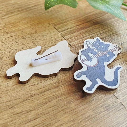 1895 The Black Cat Playing Banjo Vintage Wooden Pin, Antique Black Cat Lapel Pin, Funny Cat Lover Gift